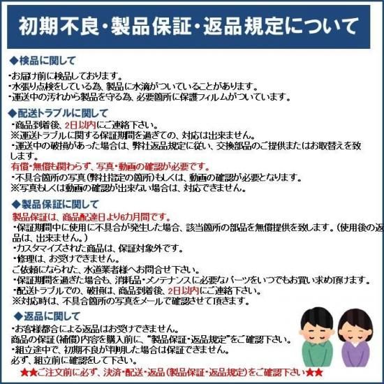 輸送時における破損や製品に初期不良があった場合には、商品到着後2日以内に不具合部の写真をお送り下さい。送料を弊社負担の上、交換させて頂きます。商品到着後1週間以降または商品組立後は初期不良対応を致しかねます。