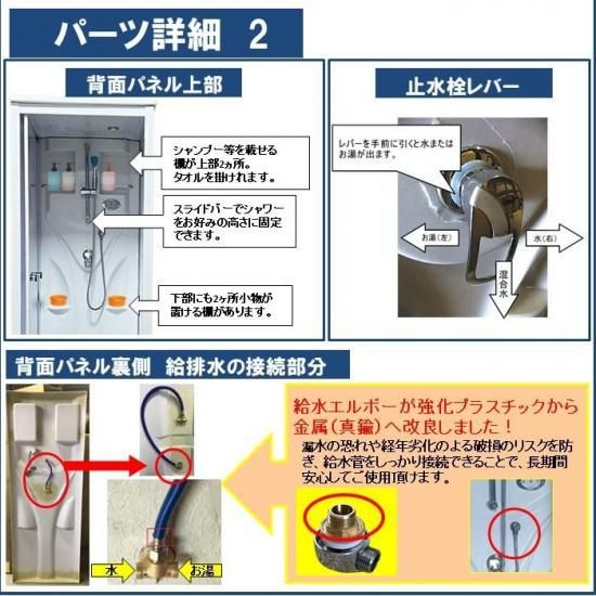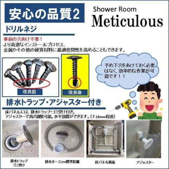 組立作業は工具を使える方2名で、2時間〜半日程度で設置可能です。(ただし、コーキングの時間は含まれておりません。)シャワー等の水栓金具は背面パネルに取り付け済ですので、組立家具のようにビスで床パネルや背面パネル等を固定するだけで簡単に設置できます。その後コーキングと給排水のつなぎ込みを行います。